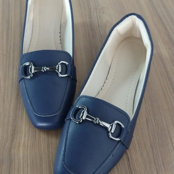Mocassim bico quadrado Azul com Detalhe Prata