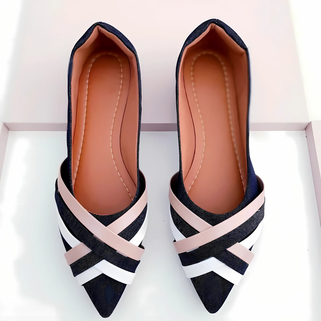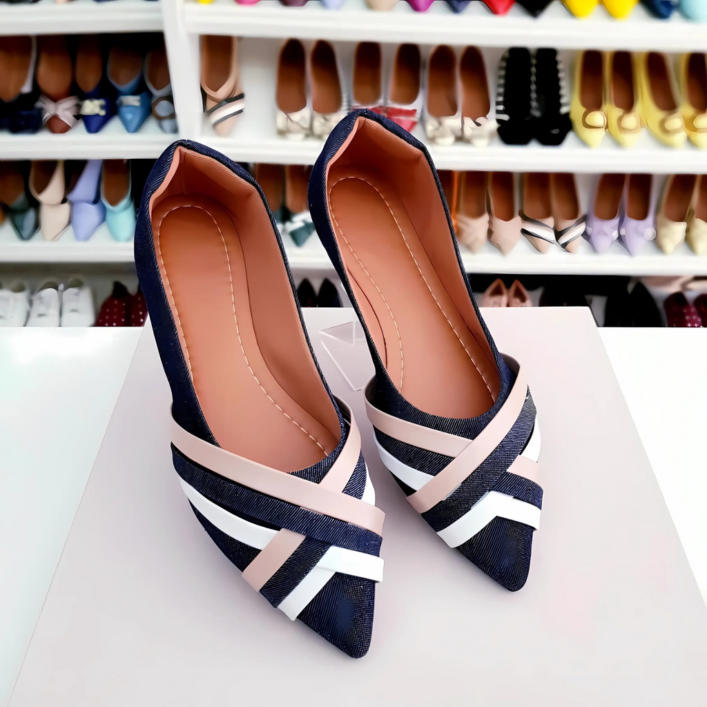 Sapatilha Prime bico fino alongada Jeans com tiras branca e caramelo