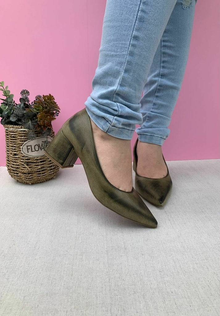 Cor: Verde Oliva envelhecido ( Com Efeito queimado/sobreado) Material externo: Napa Material interno: Forro em cacharrel Solado: PVC Bico: Alongado Detalhes: Acabamento sofisticado Salto: 5 cm Forma: Normal